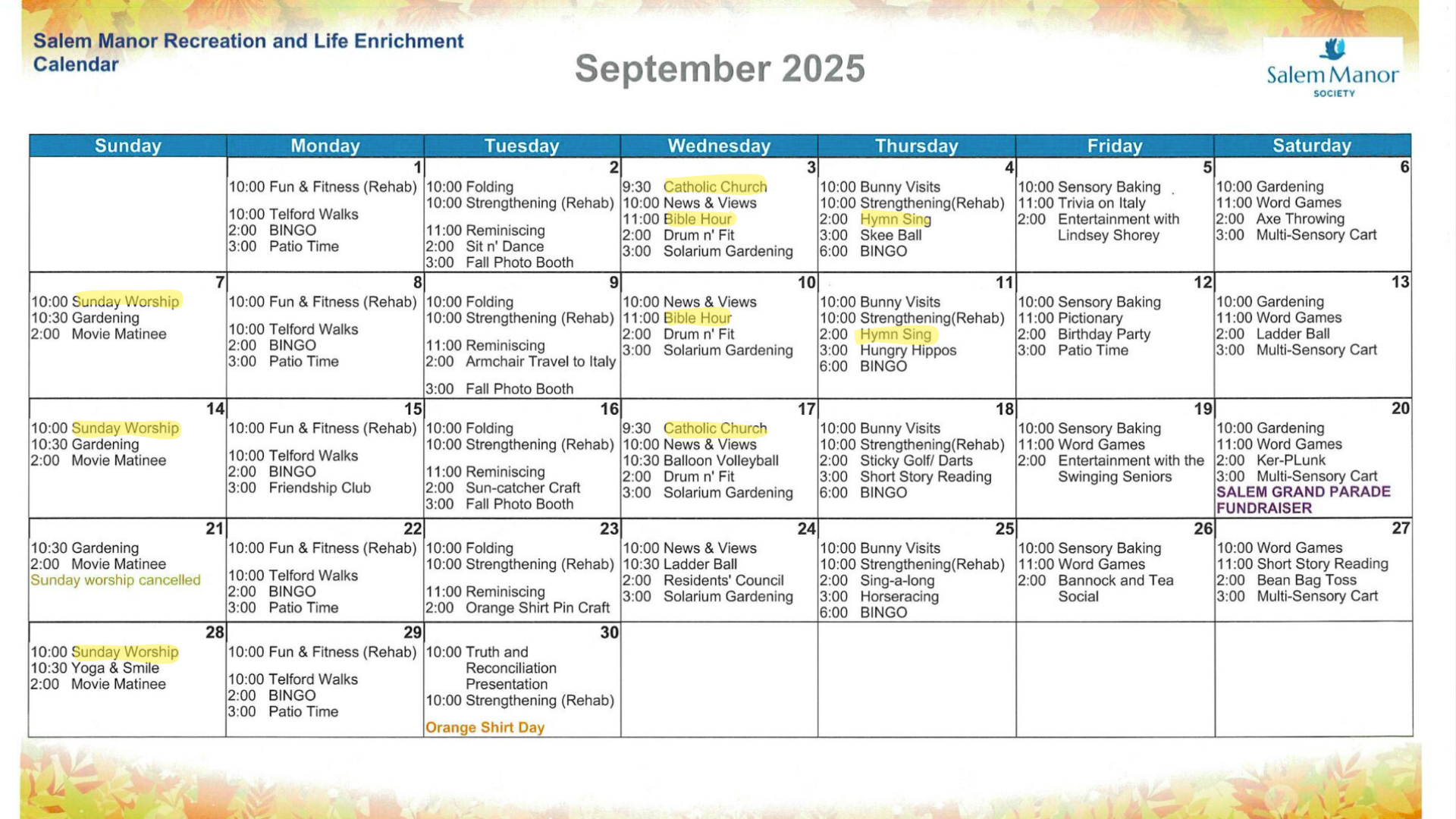 If you would like to gain access to an Activity Pro account, please reach out to our Recreation Therapist at shannonagotnes@salemsociety.ca. We’re happy to help you stay connected and informed.